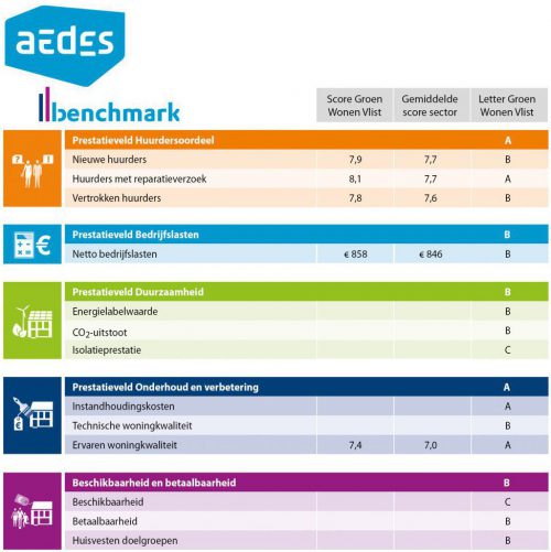 Brancheorganisatie Aedes meet ieder jaar de prestaties van woningcorporaties. Alle deelnemende woningcorporaties worden met elkaar vergeleken en verdeeld in klassen. Groen Wonen Vlist doet ook ieder jaar mee aan de benchmark.